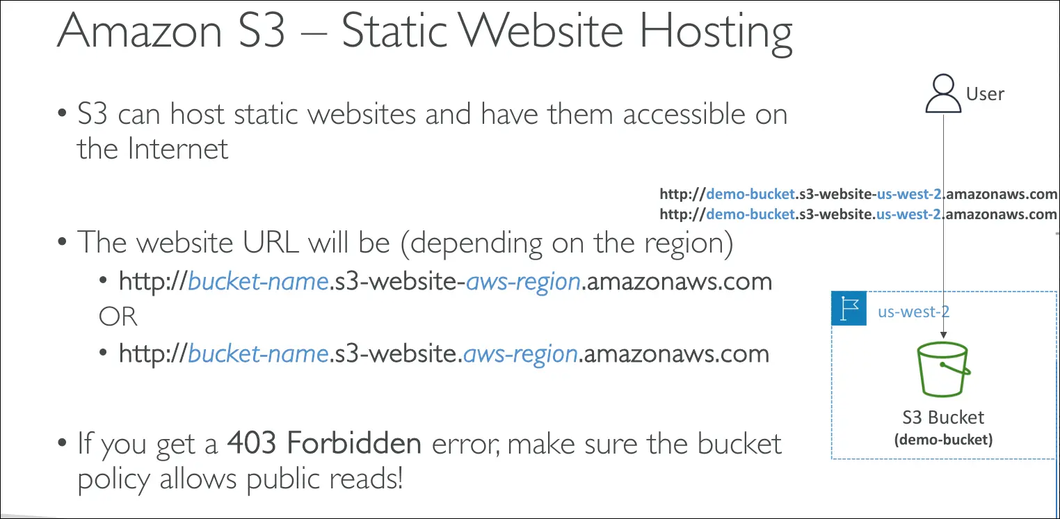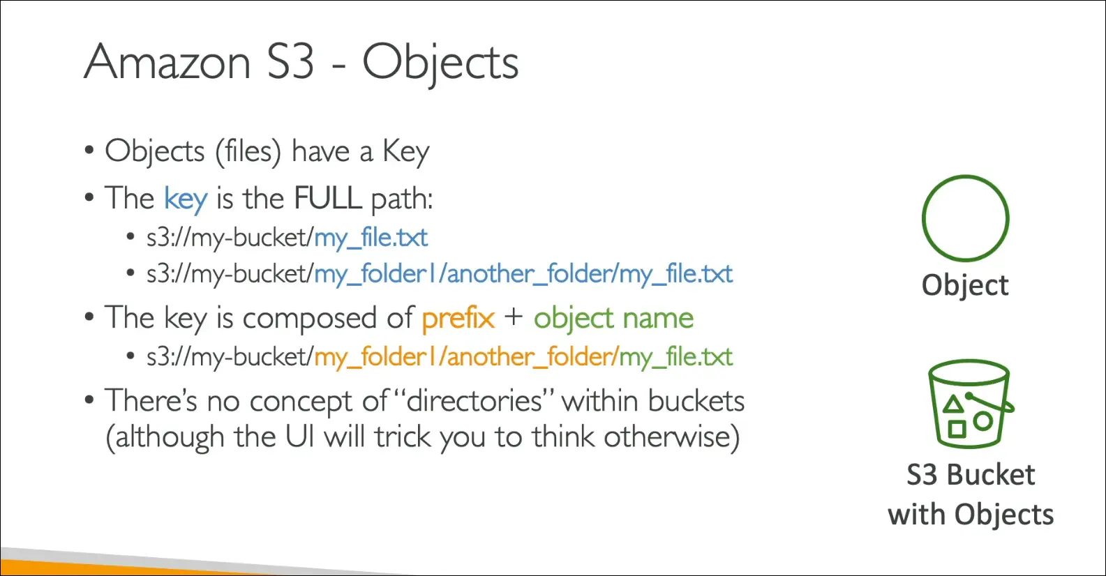 - S3 does not actually have directories, only keys with slashes (UI simulates folders).