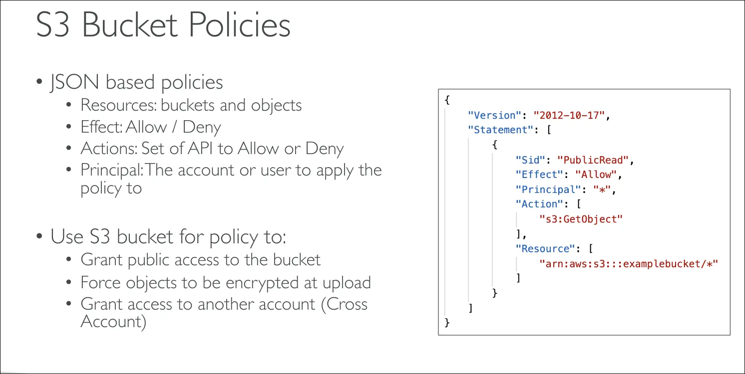 - S3 Bucket Policies: JSON documents attached at the bucket level.