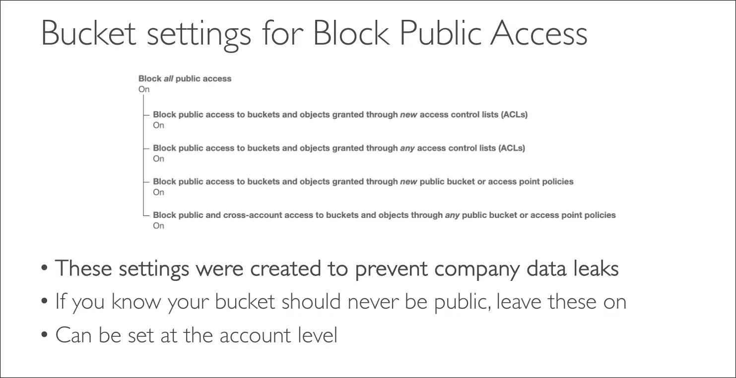 Key exam point: IAM Access Analyzer helps detect unintended access to S3 buckets by checking policies and ACLs, highlighting public or cross-account sharing.