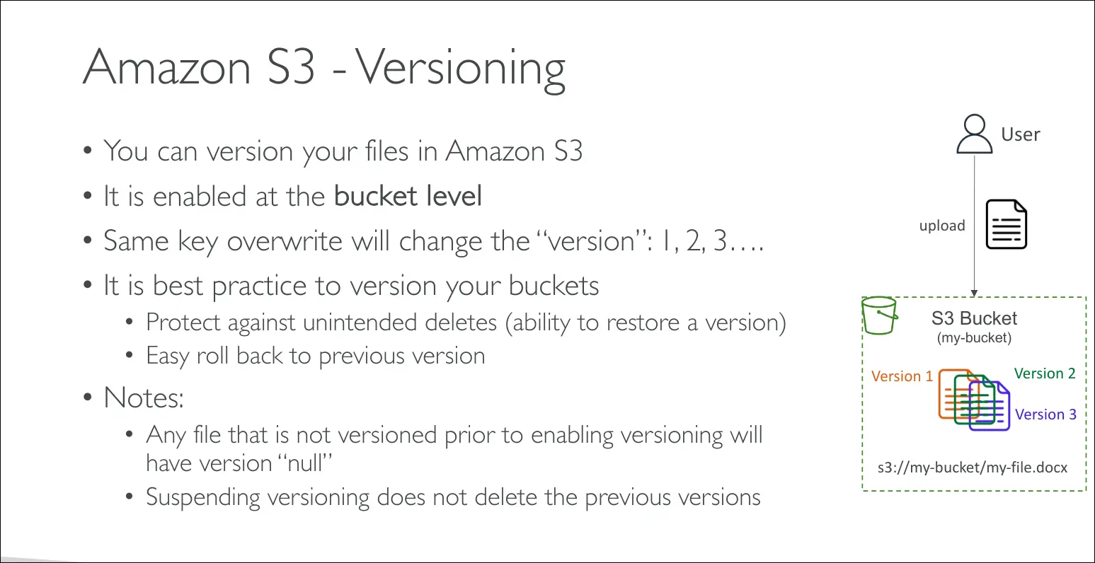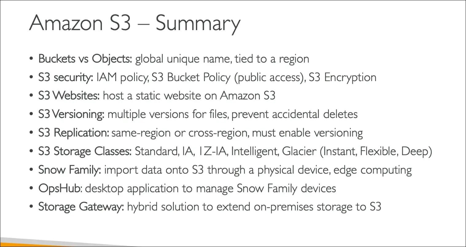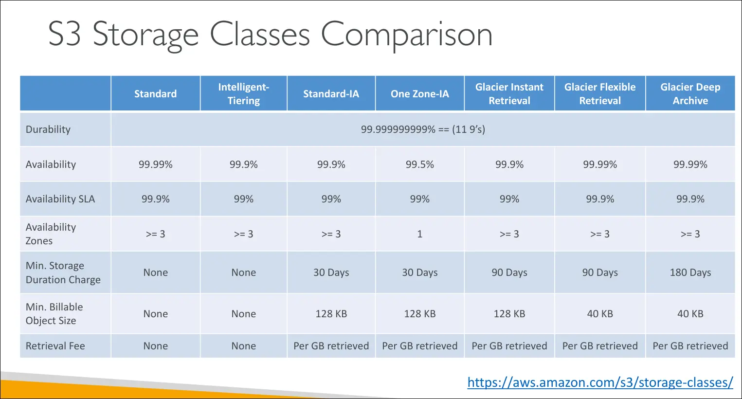 - Cost optimization: choose the right storage class (Standard, IA, Glacier, etc.) based on needs.