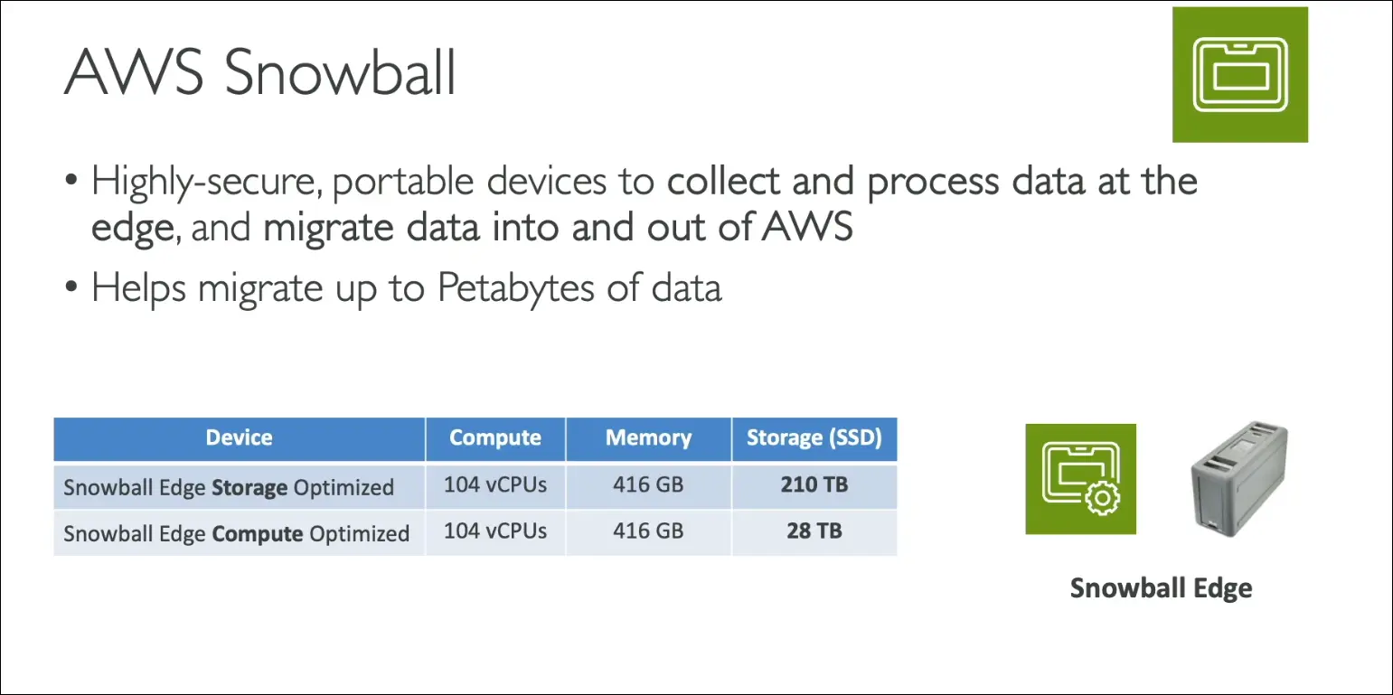 - Snowball Compute Optimized → Edge computing + EC2/Lambda at the edge.
