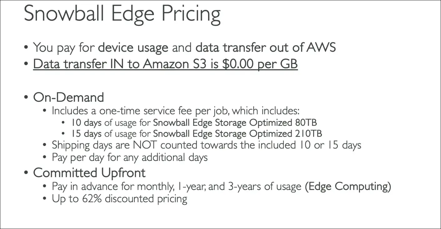 - Includes 10 days of usage (for 80 TB Snowball Edge Storage Optimized).