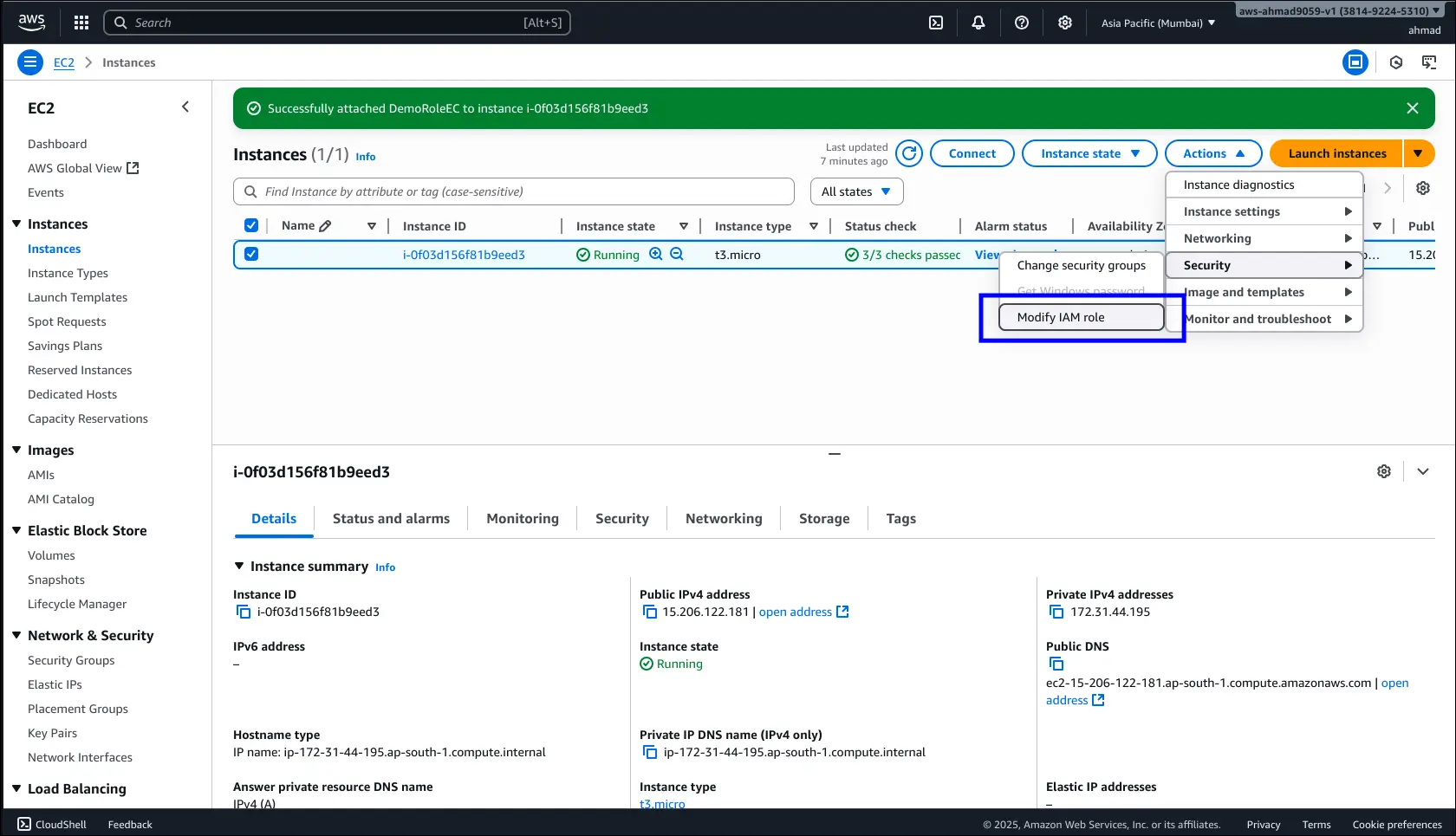 IAMReadOnlyAccess). - Attach the role to your EC2 instance (Actions → Security → Modify IAM Role).