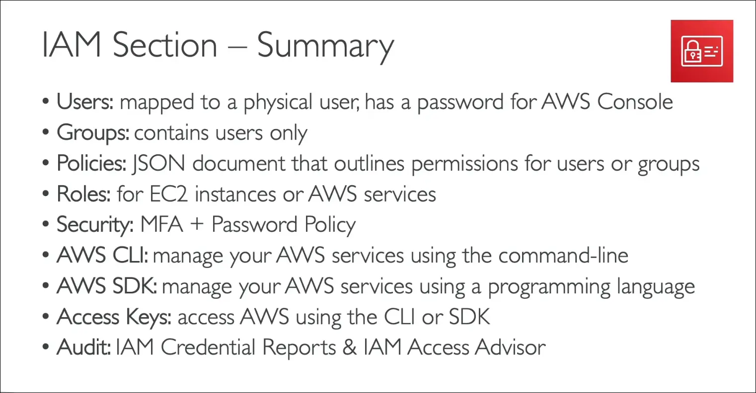 - Policies (JSON documents) can be attached to users or groups.