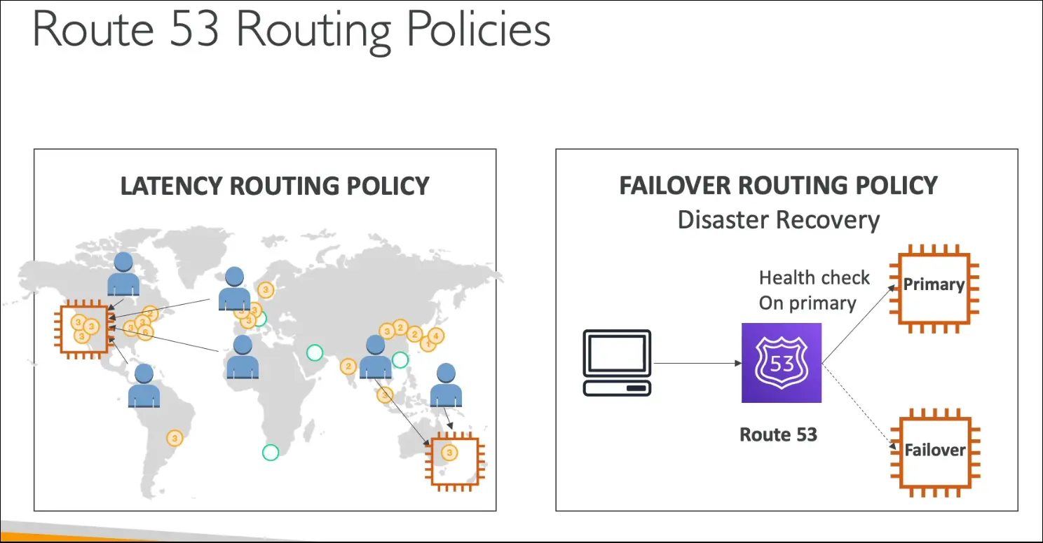 - Routes traffic to the resource with the lowest latency (closest AWS Region).