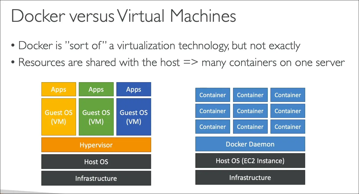 - Infrastructure → Host OS (EC2) → Docker Daemon → Containers.