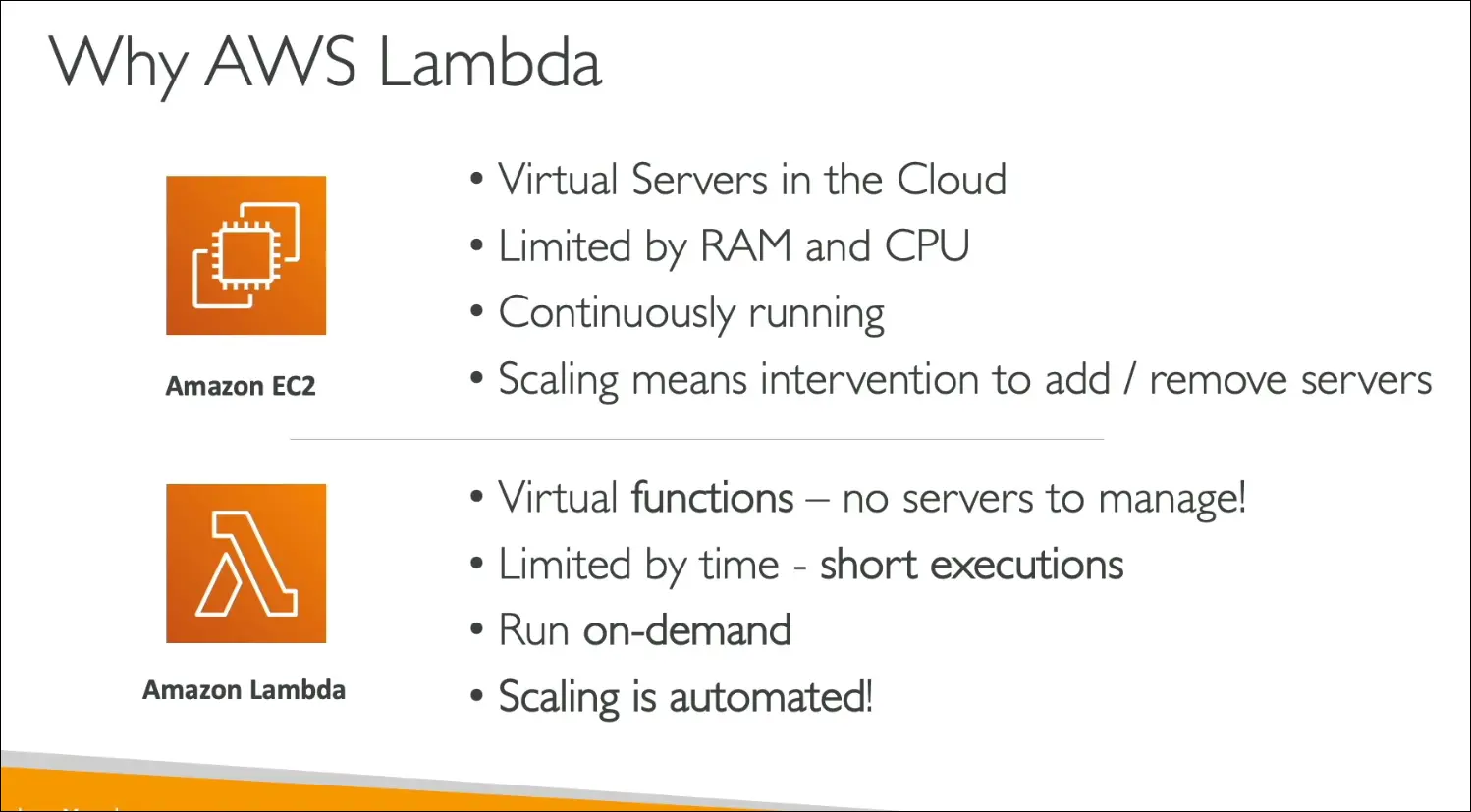 | Lambda | Serverless | Short-running functions (≤ 15 min) |