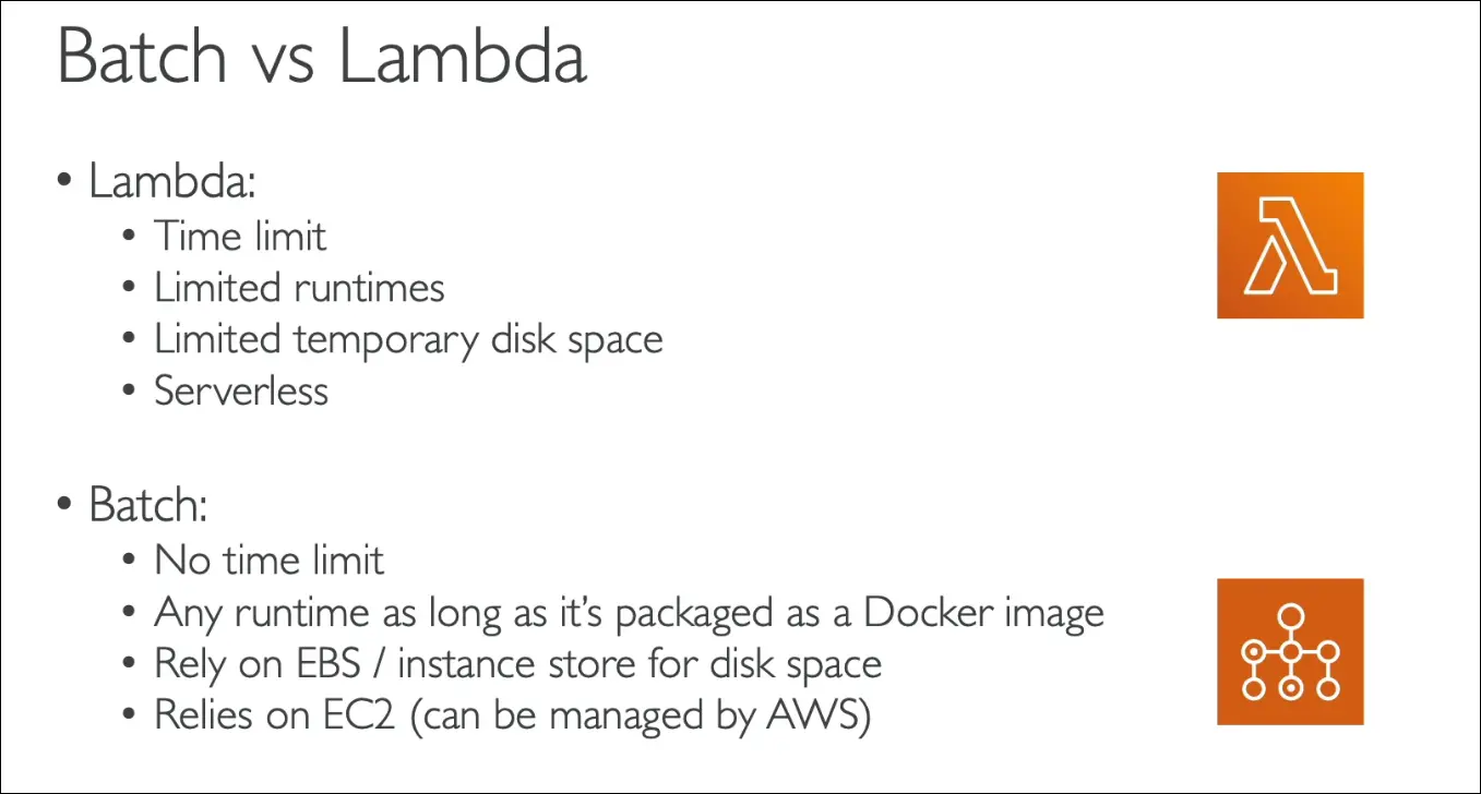 - Remember: AWS Batch is not serverless, but AWS manages the EC2 infra for you.